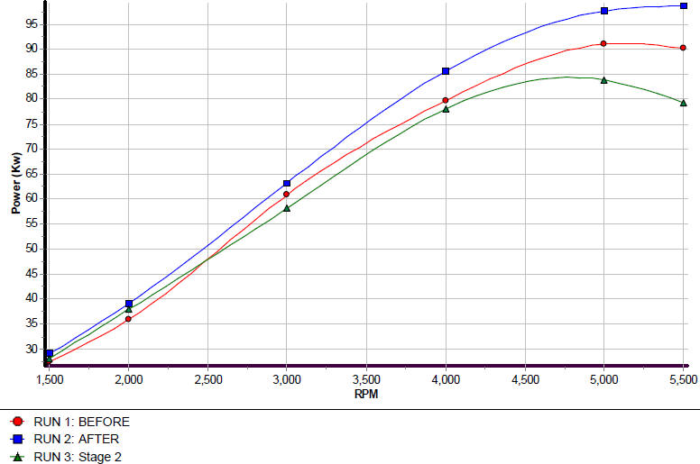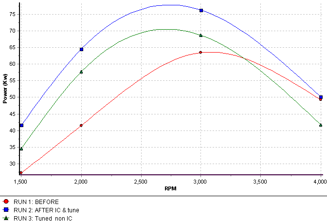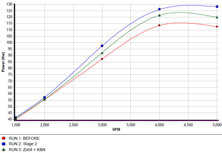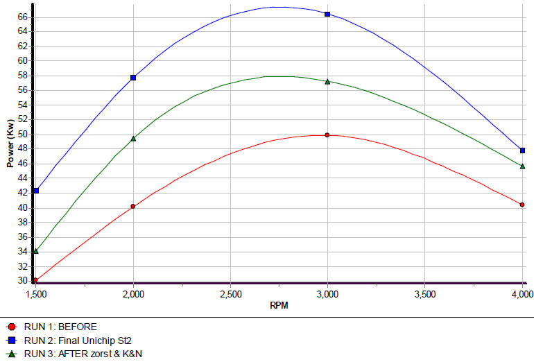 Run 3 is with the exhaust and K&N, but with no tuning- showing how much is